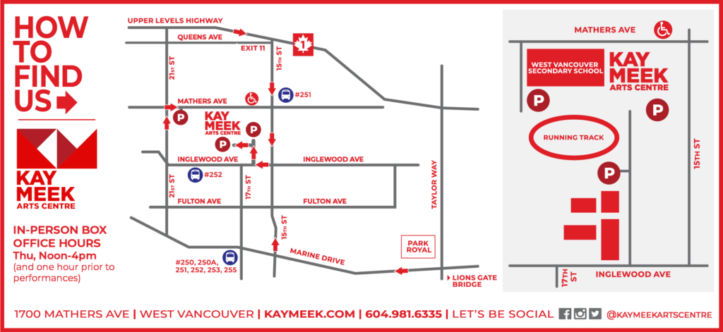 We are located at 1700 Mathers Avenue, beside West Vancouver Secondary School. The closest bus stops are served by routes 251, 252, and 257.