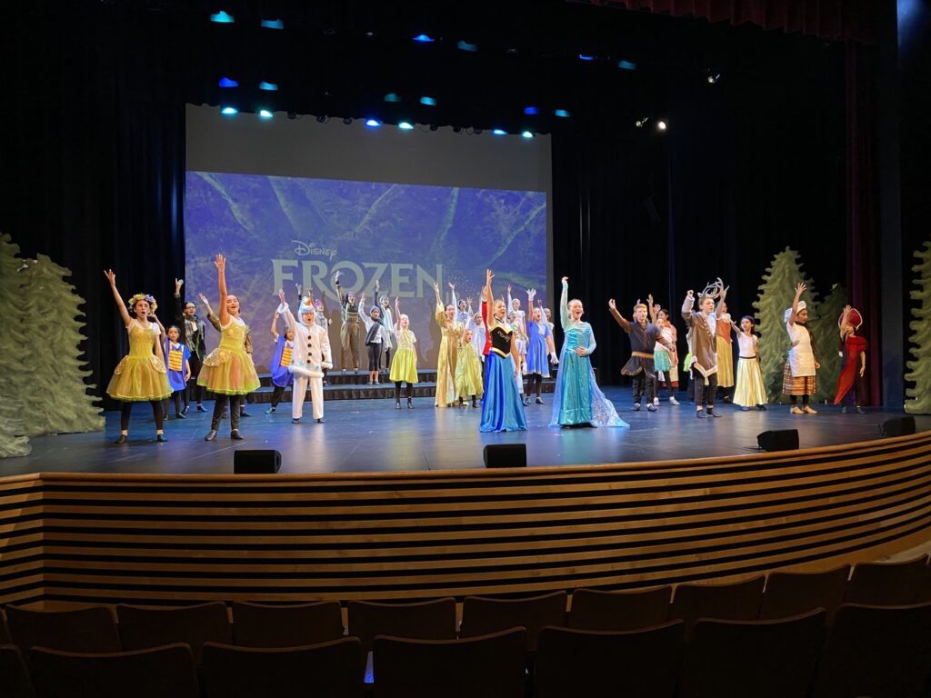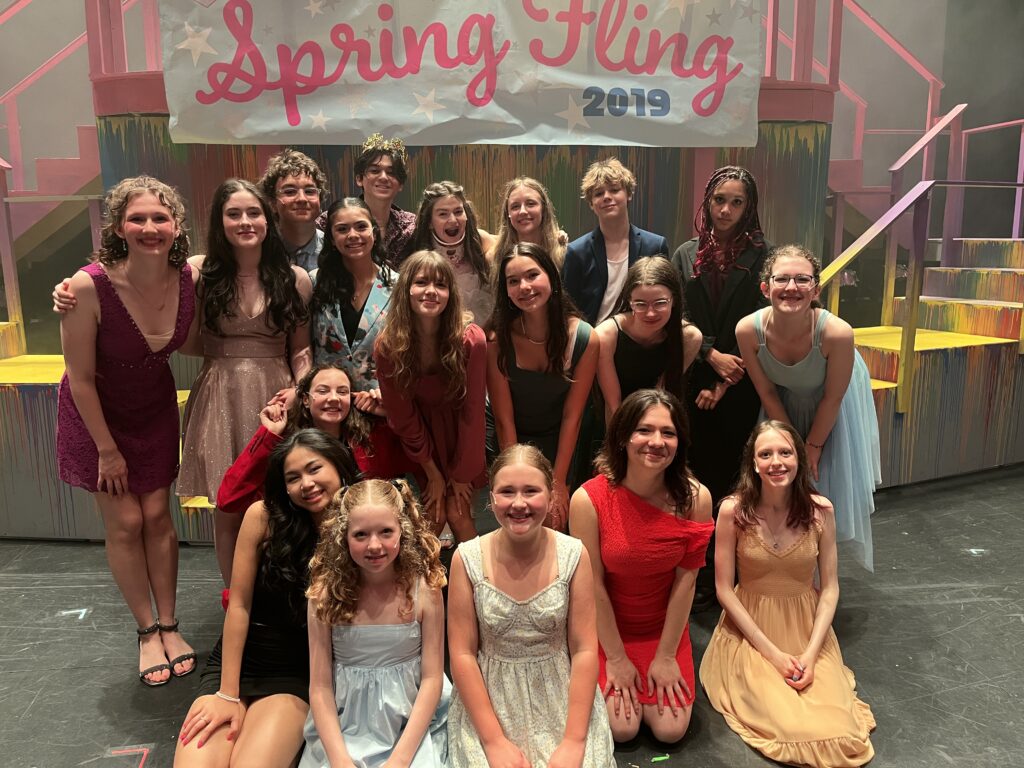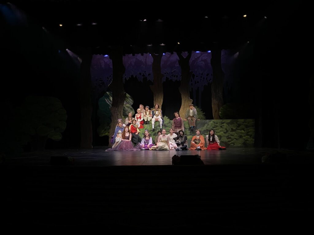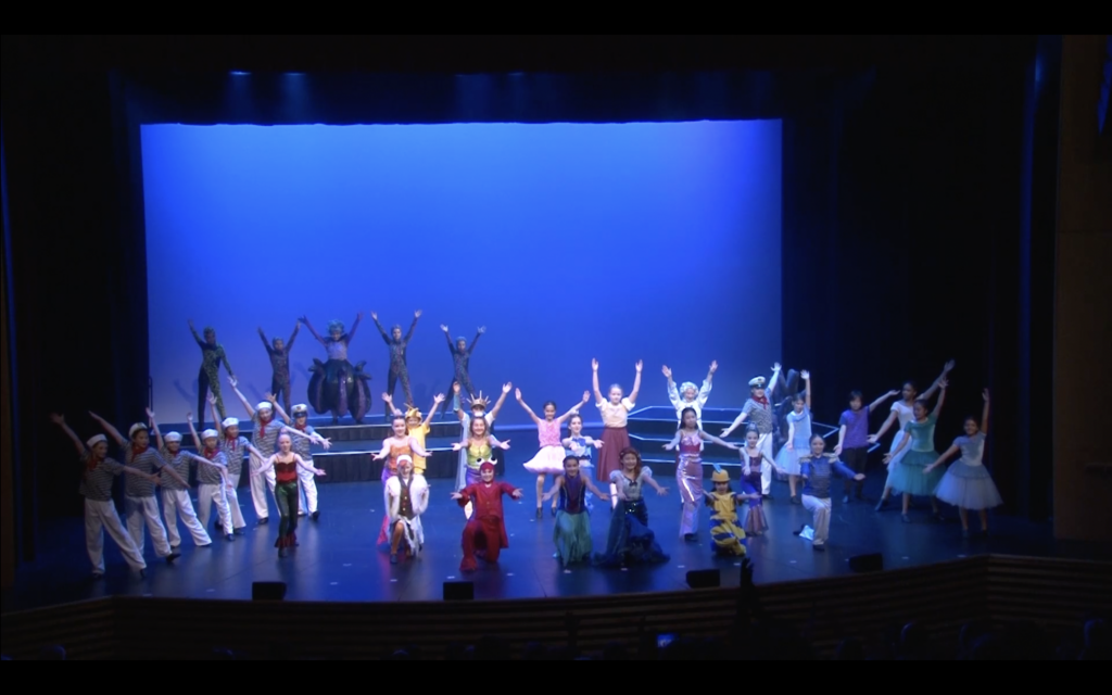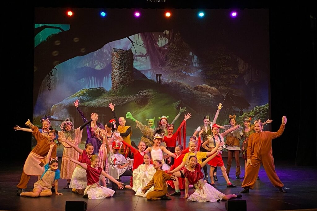 Students from the Kay Meek Youth Conservatory are posing on a dark stage with a colourful backdrop
